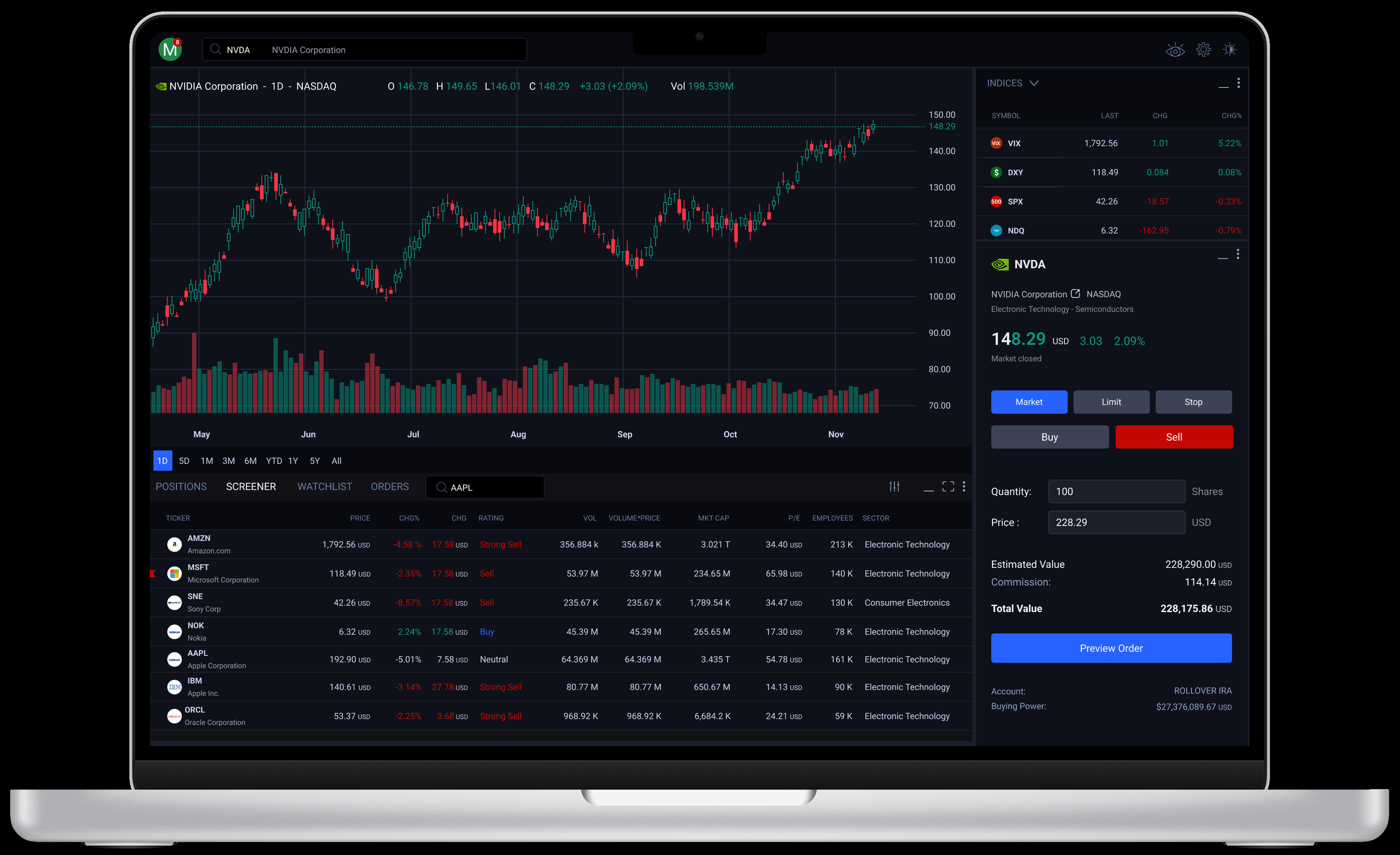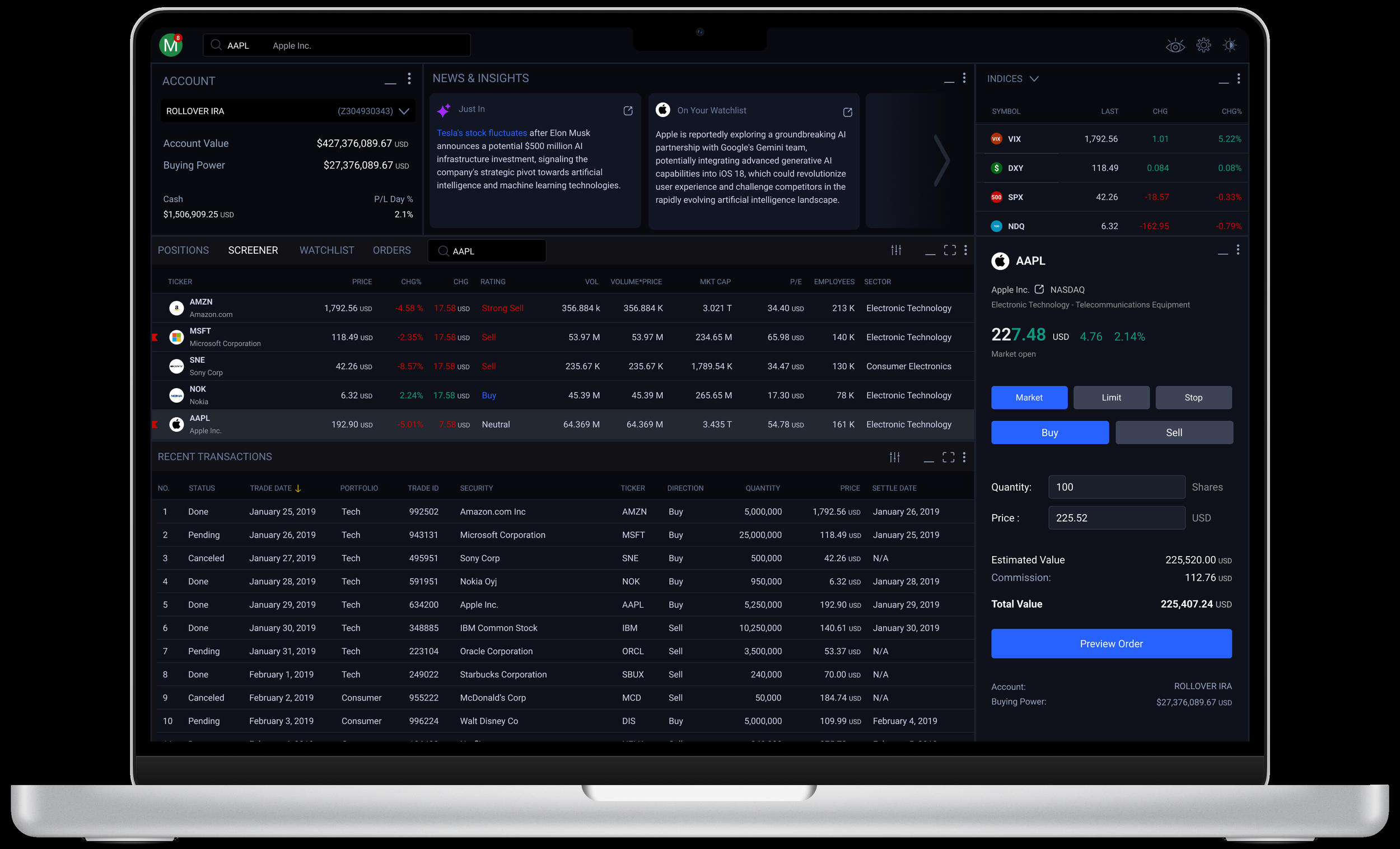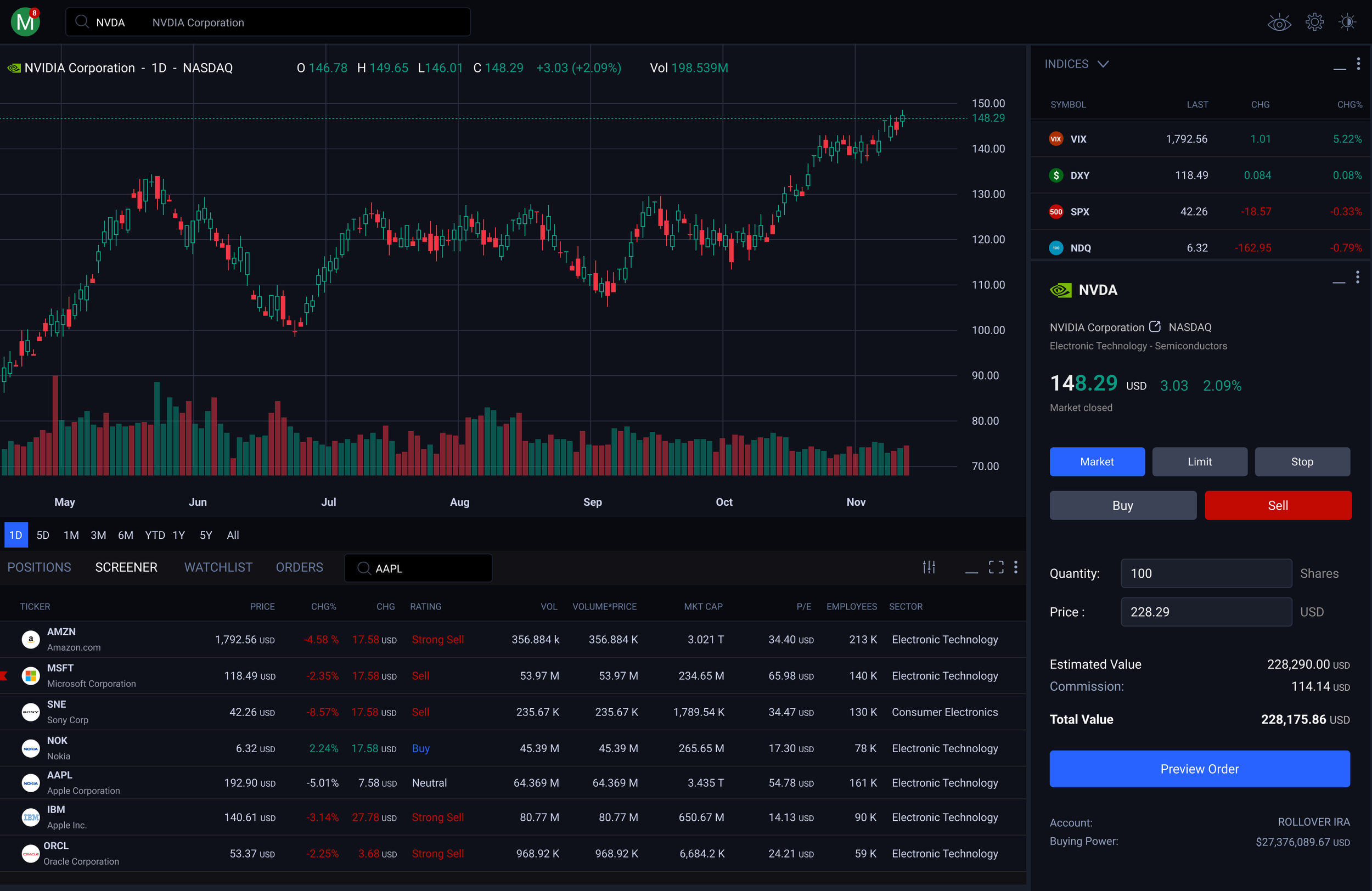 This contains the base patterns for displaying tabular content in a trading application, such as watch lists, indices, and positions. It also includes a ticket for trade execution, a news component, and a basic display for account information.