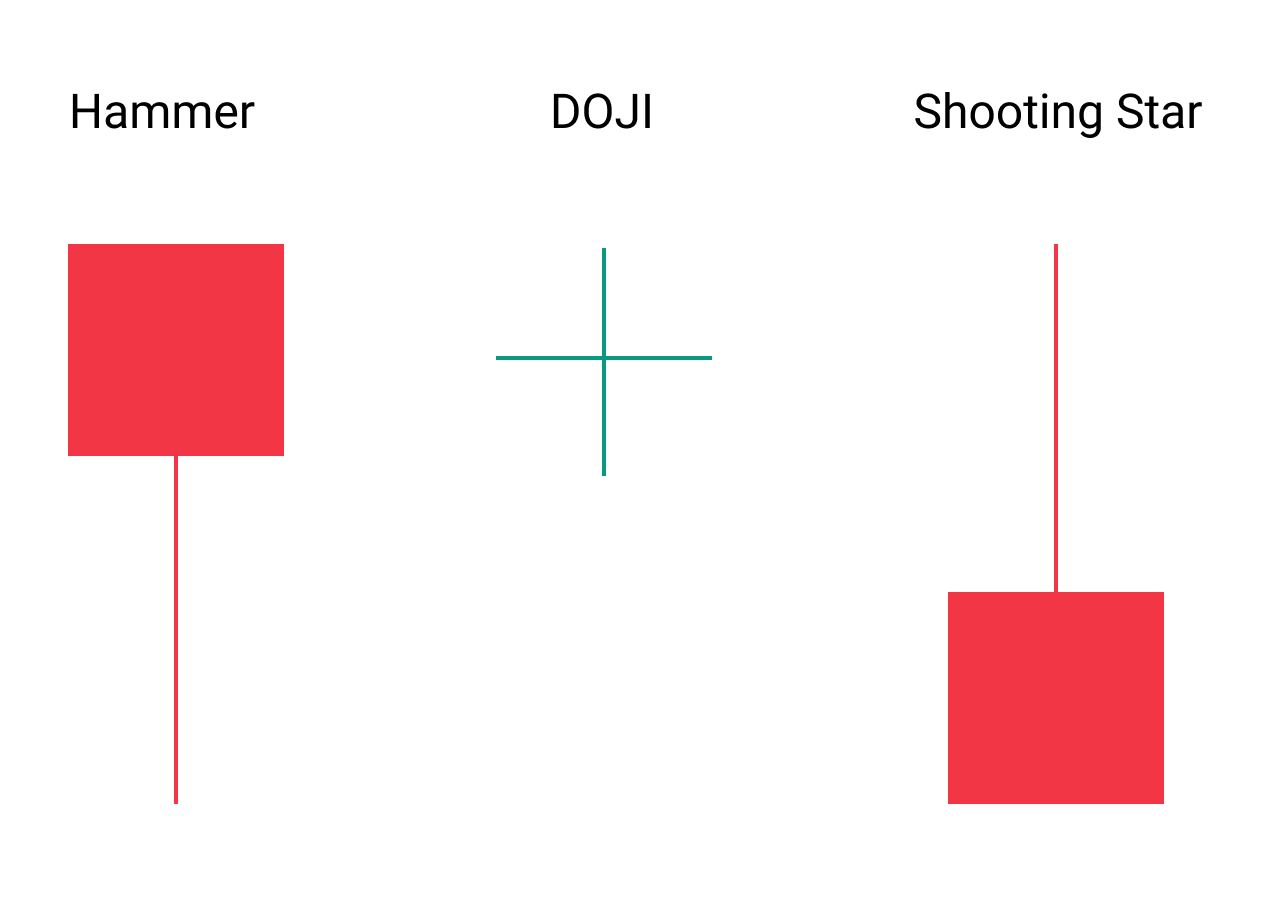 Here, I'm showing three examples of common candlestick patterns—from the “hammer” candle (or the “hanging man”—when it indicates a pullback), to the very important DOJI, and the bearish “shooting star” candle.